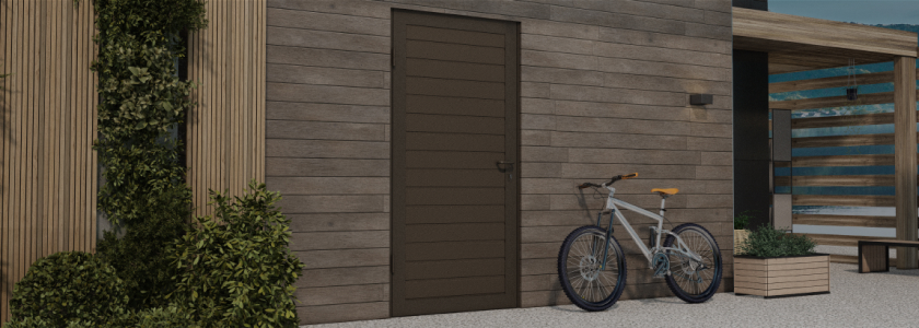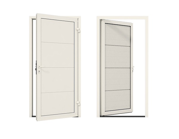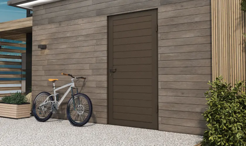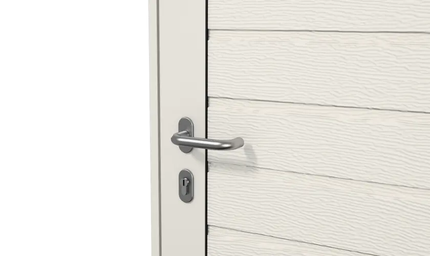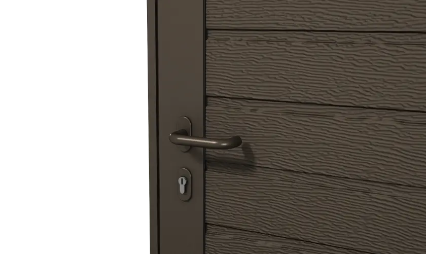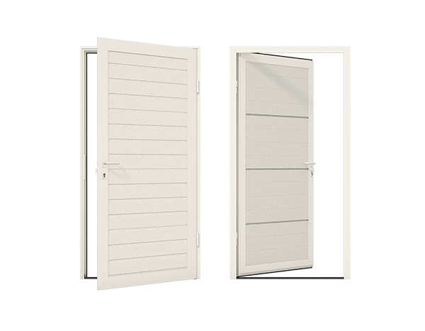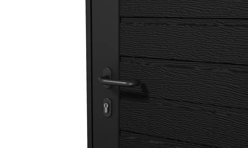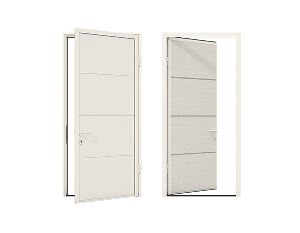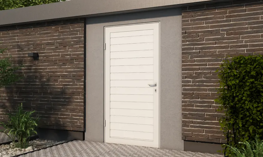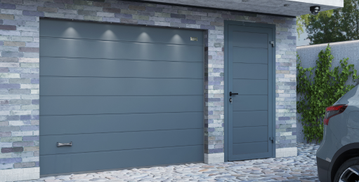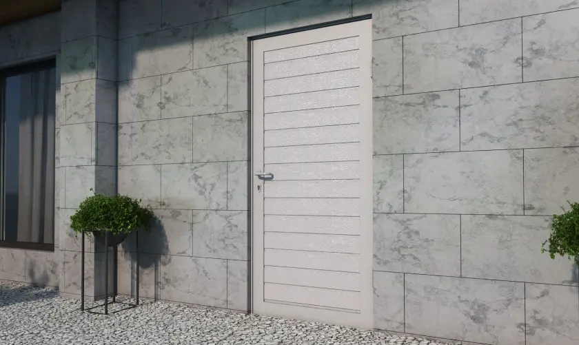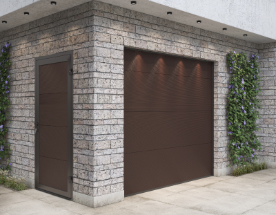 Боковые двери изготавливаются из тех же панелей, что и ворота. Благодаря этому они гармонично сочетаются между собой, а фасад гаража приобретает завершенный вид.